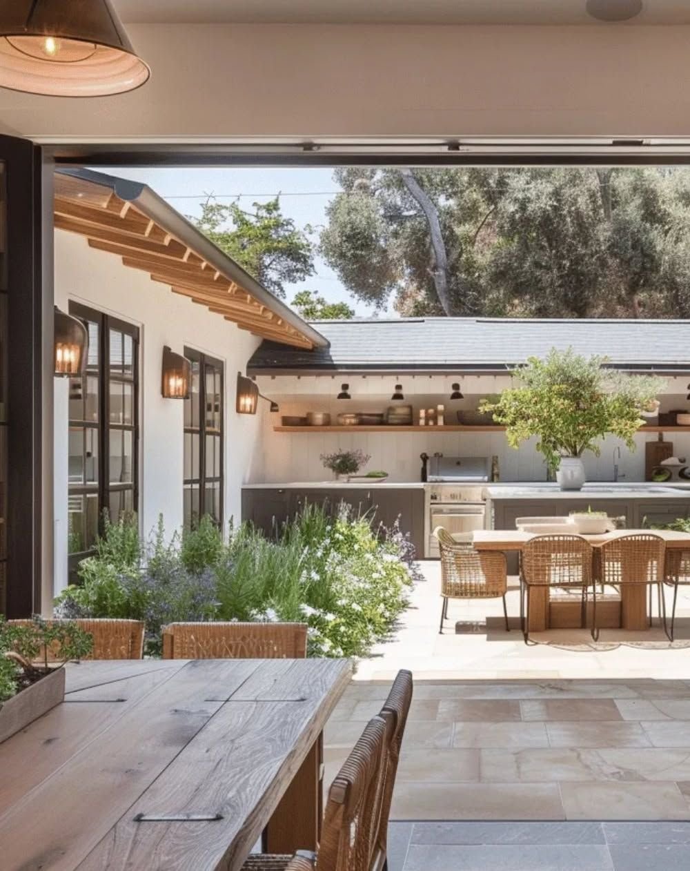 Imagine: A wooden pergola with a natural finish. A farmhouse-style dining table with benches. Vintage metal chairs as additional seating. Galvanized metal planters with herbs. Edison bulbs on simple cord. Everything feels collected and comfortable, not too precious.