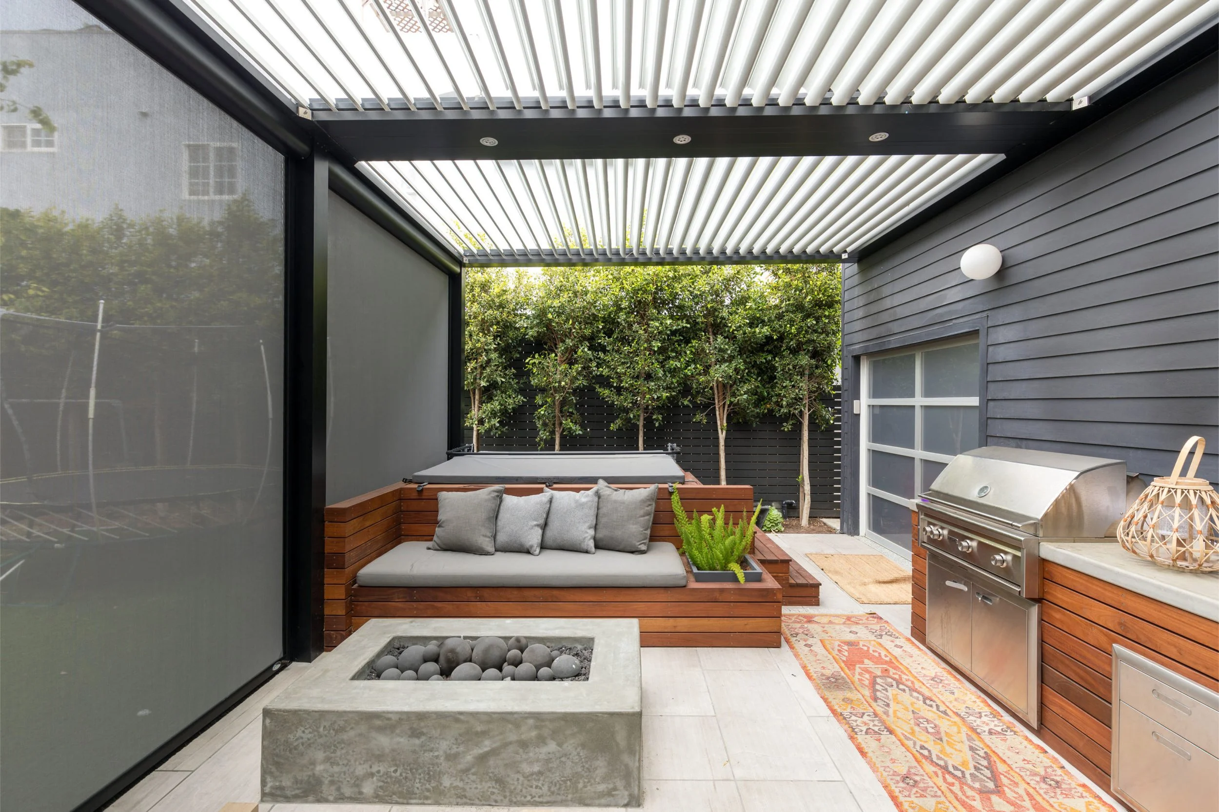 Imagine: A large motorized pergola covering a complete outdoor living space. One end has a full sectional facing a wall-mounted outdoor TV. The other end has a bar area and outdoor kitchen. Heaters are built into the pergola. Screens can drop down on two sides for wind and bug protection. Everything is designed for serious entertaining.