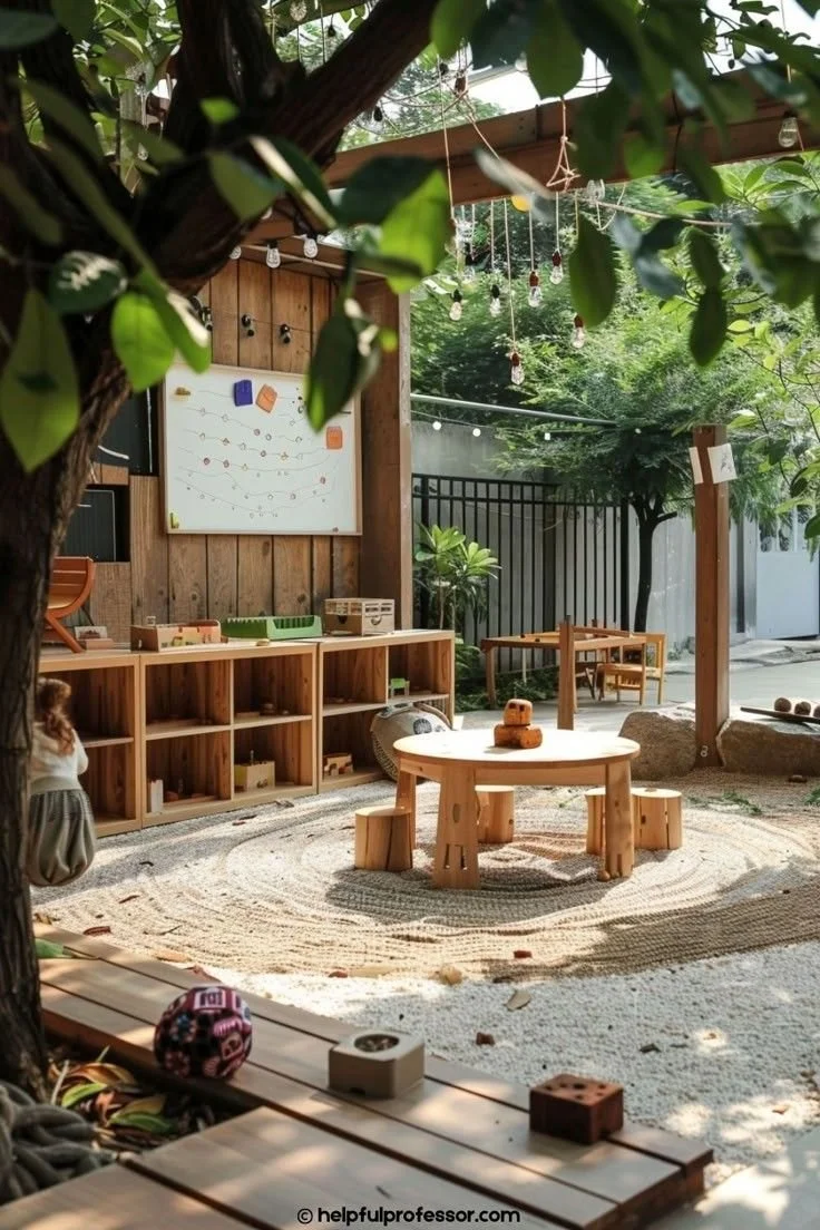 Imagine: A wooden pergola draped with soft white curtains that billow in the breeze. A low sectional covered in mix-and-match pillows in terracotta, cream, and dusty blue. Moroccan-inspired lanterns hanging at different heights. A jute rug anchoring the space. Plants everywhere—hanging, potted, climbing.